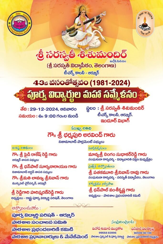 నిజామాబాదు జిల్లా లోని ఆర్మూర్ లో గల ప్రాఖ్యాతి గాంచిన శ్రీ సరస్వతి శిశుమందిర్ పాఠశాల 43 వ వసంతోత్సవం పూర్వ విద్యార్థులు అనగా 1981 వ సంవత్సరాల నుండి 2024 వరకు గల విద్యార్థులు ఈ మహా సమ్మేళనం లో కలుసుకోని మరియు వారి యొక్క అనుభవలను పంచుకోనున్నారు. ఈ కార్యక్రమనికి ముఖ్య అతిథి గా శ్రీ ధర్మపురి అరవింద్, నిజామాబాదు పార్లమెంట్ సభ్యులు మరియు ఎమ్మాల్యే లు ఆర్మూర్ మరియు నిజామాబాదు పాల్గొనున్నారు.